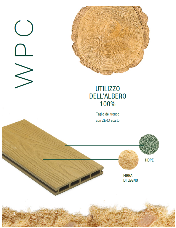 Si tratta di un materiale composito realizzato con fibra di legno, polietilene HDPE, agenti anti UV e protettivi/antiossidanti.