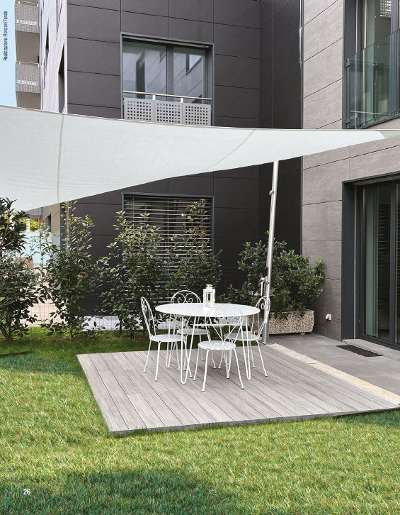 - GREEN - realizzato in legno composito con fibre di legno derivanti da scarti di lavorazione e polietilene riciclato HDPE.